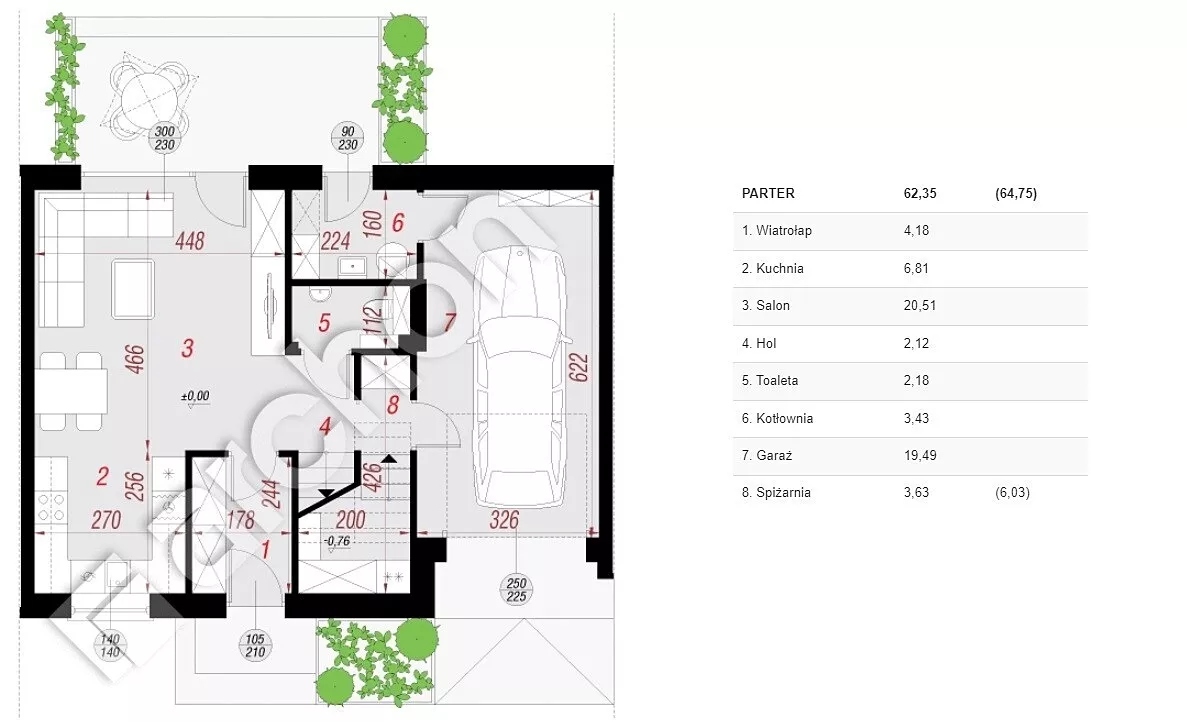 - Na parterze zaprojektowano salon z aneksem kuchennym i wyjściem na ogród z tarasem, wiatrołap, toaleta oraz dodatkowa przestrzeń pod schodami, którą można zaprojektować jako spiżarnię. W bryle budynku będzie jednostanowiskowy garaż oraz kotłownia wyposażona w pompę ciepła. Przed domem planuje się jedno dodatkowe miejsce postojowe.