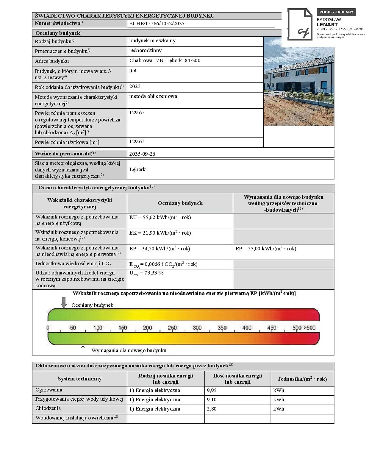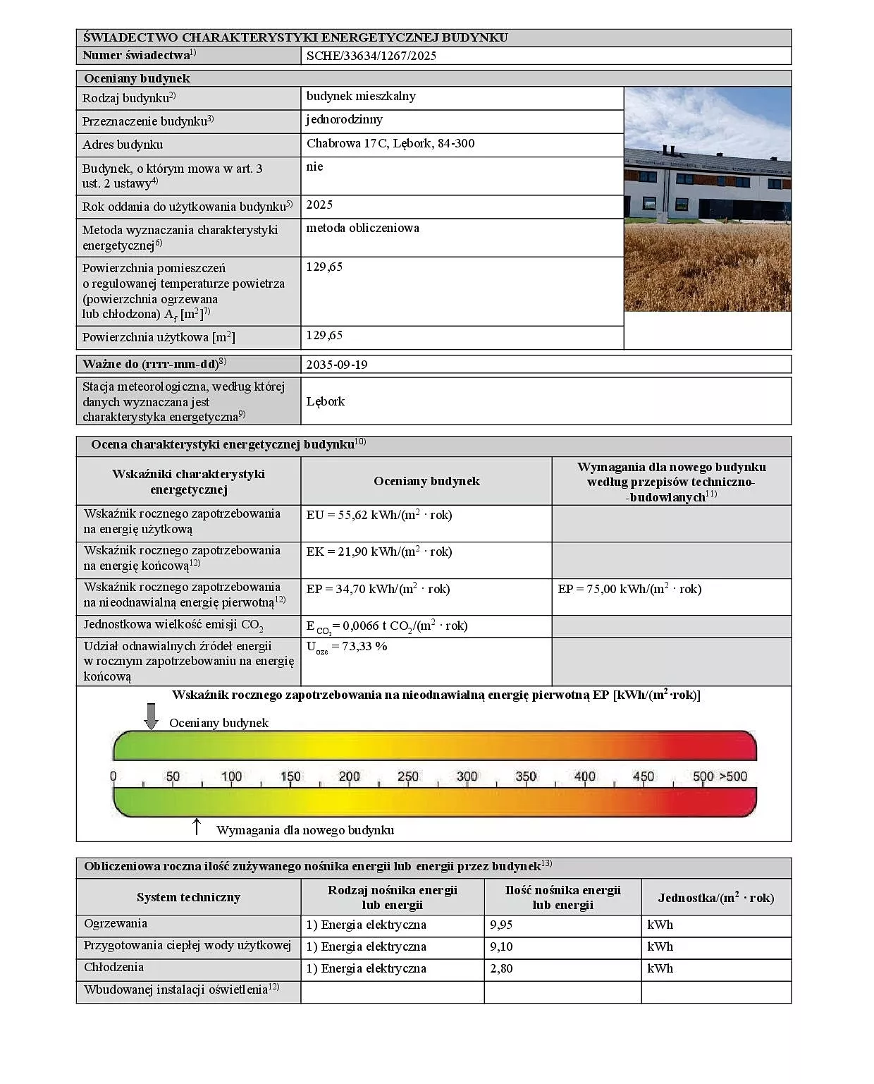 Wskaźnik rocznego zapotrzebowania na nieodnawialną energię pierwotną (EP): 34,70 kWh/(m²·rok)