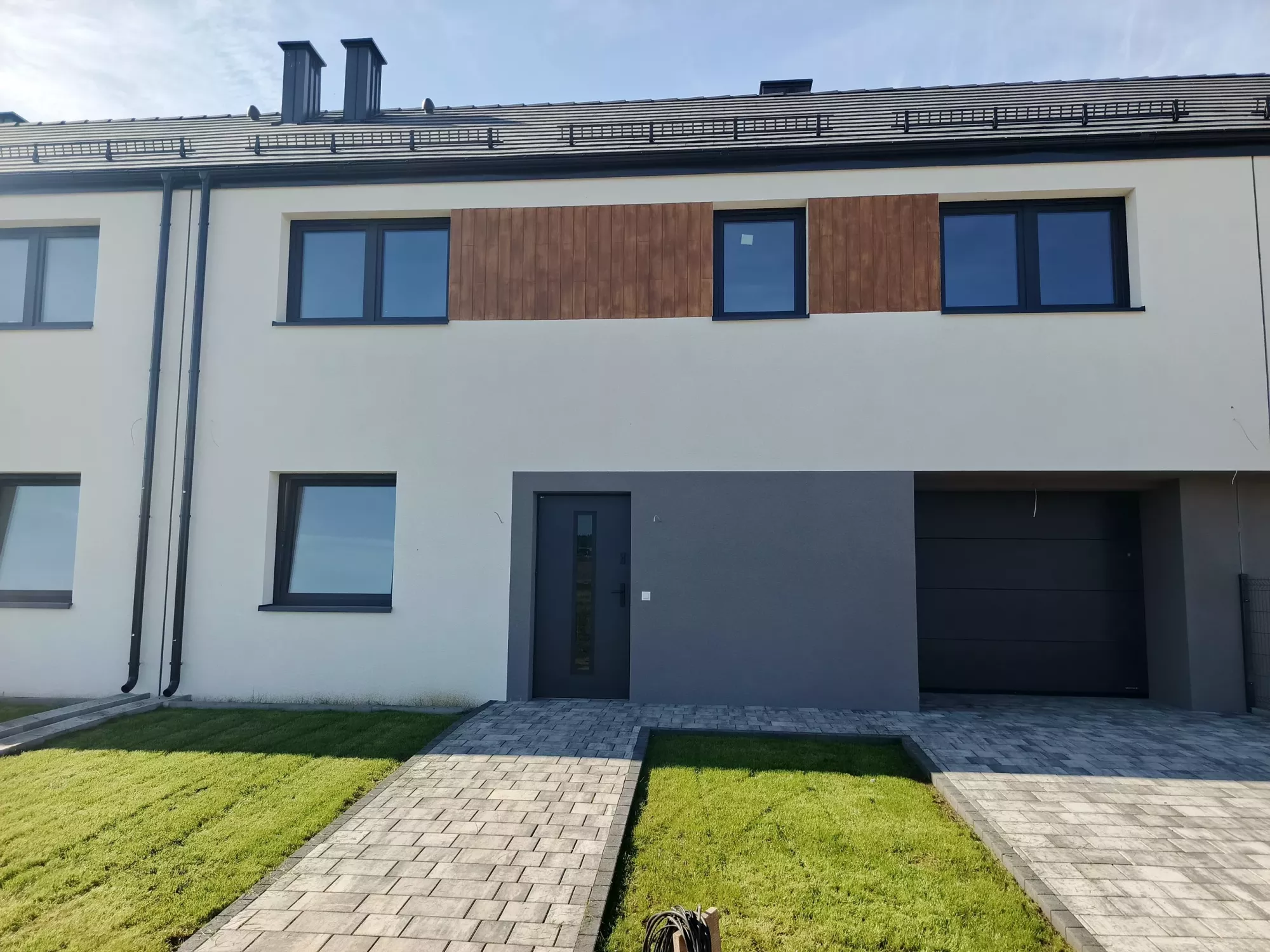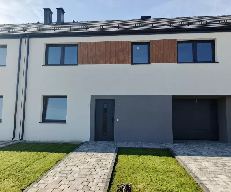 - Prostą konstrukcję bryły wieńczyć będzie dwuspadowy dach bez okapów i elewacja wykończona jasnym i grafitowym tynkiem. Naturalnym akcentem będą elementy z drewnopodobnej okładziny, które w całości pięknie korespondować będą z kolorystyką stolarki oraz dachówki.